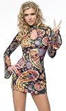 This costume is very cute and looks just as pictured. But I'm glad I knew Halloween costumes tended to run small and this one is no exception. I am usually a size M in ladies and ordered an XL. It fit, but quite snugly. Also it is VERY short. I realize that is the style of the 70s but I had to wear a black skirt with it in order to feel comfortable. But the print is bright and fun.